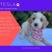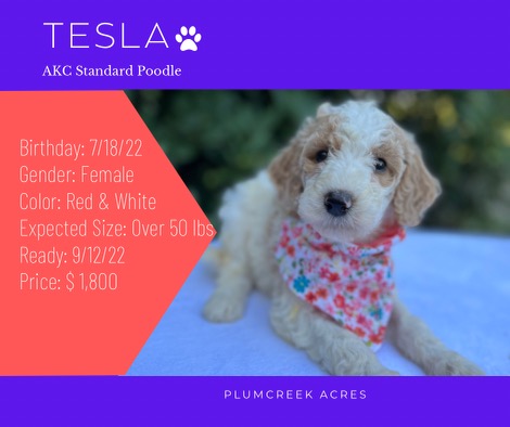 Tesla Breed: Poodle Date of Birth: 6/22/22 Sex: Female Color: White and Apricot Expected Size: 48 Coat: Curly Price: $1000 PA License: #10867